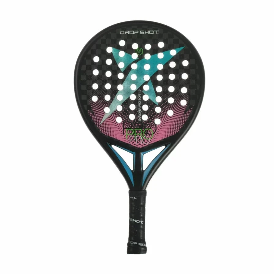 Drop Shot Explorer Pro 1.0 Soft is a teardrop-shaped padel racket targeted at a wide range of players who want a good mix of control and hitting power. The racket’s core is made of soft EVA foam, which provides high tolerance and an easy to play racket.