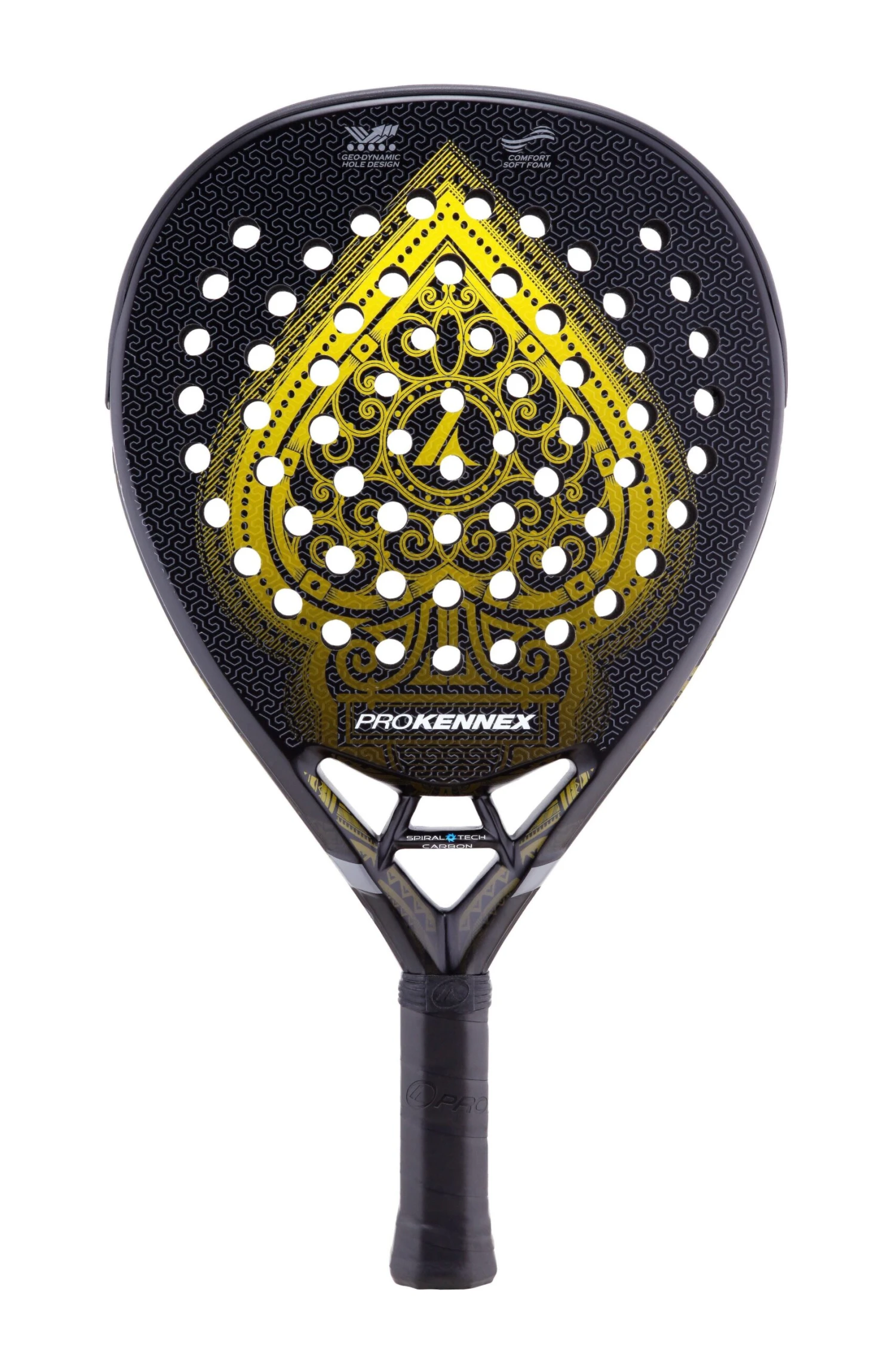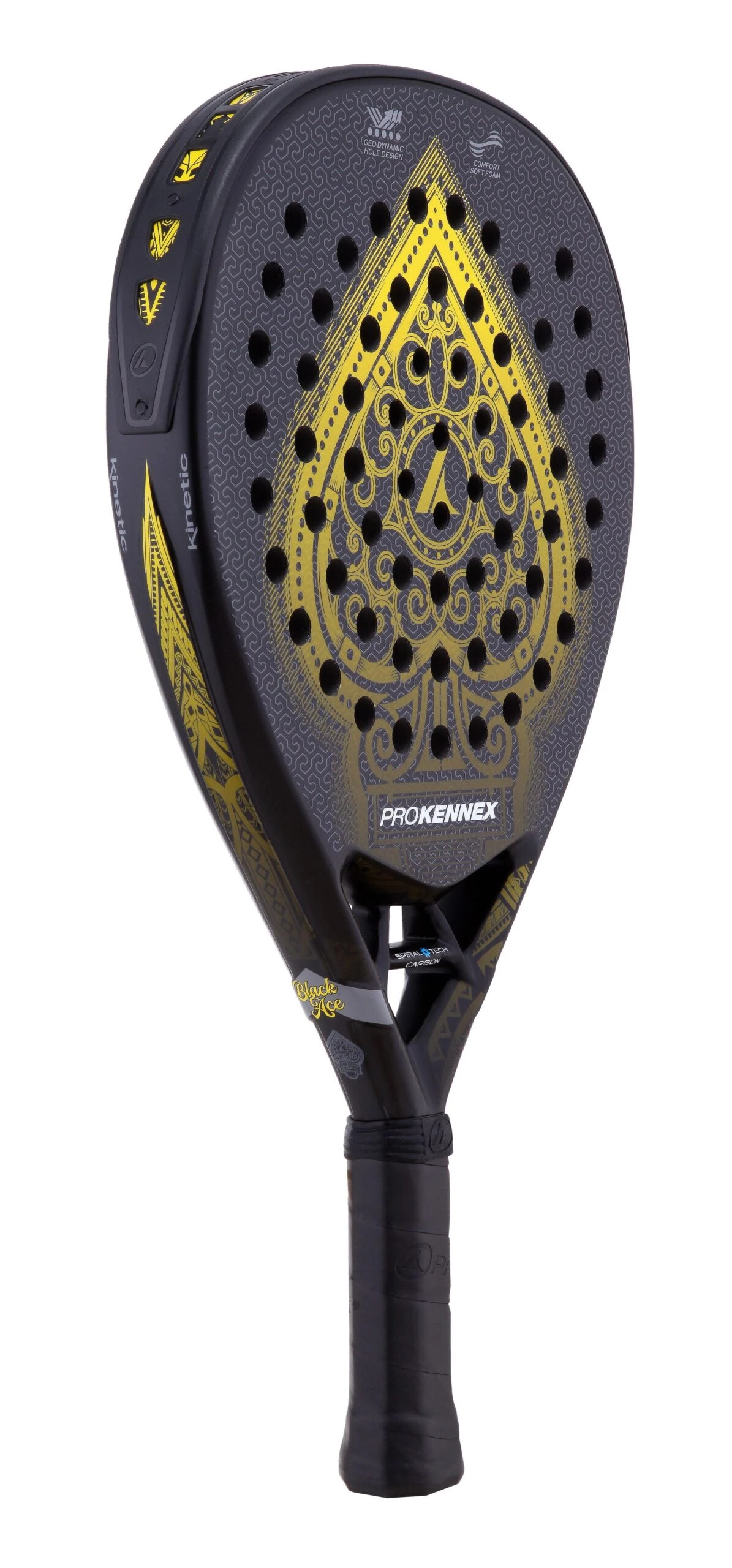 Do you want massive power in your attacks and a sumptuous design? If so, the Pro Kennex Black Ace padel racket is just what you’re looking for. The Black Ace from the traditional racket sports brand, Pro Kennex, is a diamond-shaped racket with a head-heavy weight distribution in prominent black and gold shades.