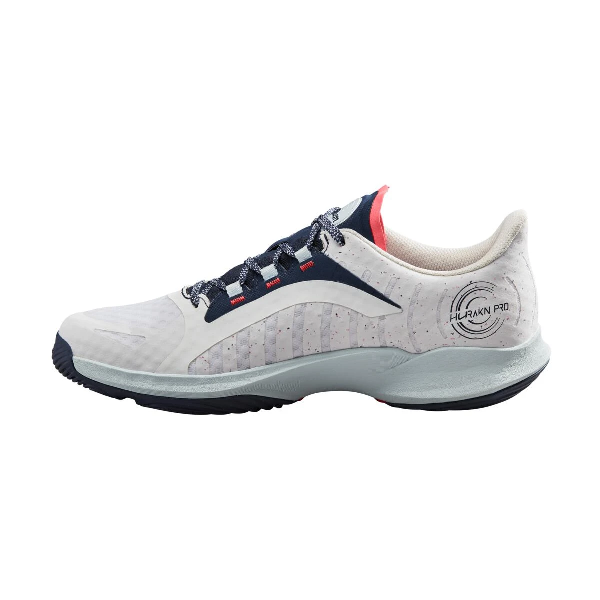 The Wilson Hurakn Pro (White Cooling Spray/Navy Blazer) is specially designed to support your movements on the padel court. As such, the outsole is constructed with Wilson’s Optimum Grip technology, which includes varying patterns at the forefoot and heel to ensure a secure footing on the court surface.
